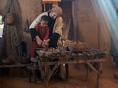 A wooden table is laden with primitive tools and a father wraps his arms around his son together holding a hammer and fastening a nail.